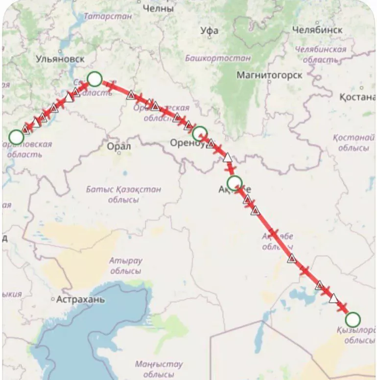Байконур — Актобе — Оренбург — Саратов.