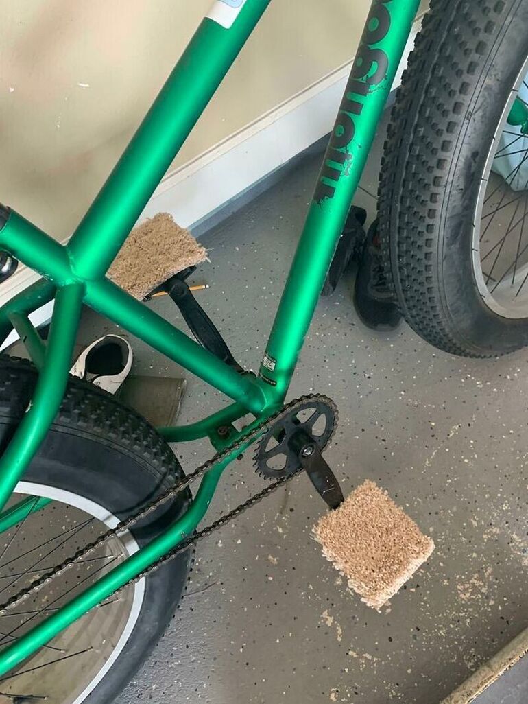 12-летний велосипедист решил закрепить на педалях коврики, чтобы кататься босиком