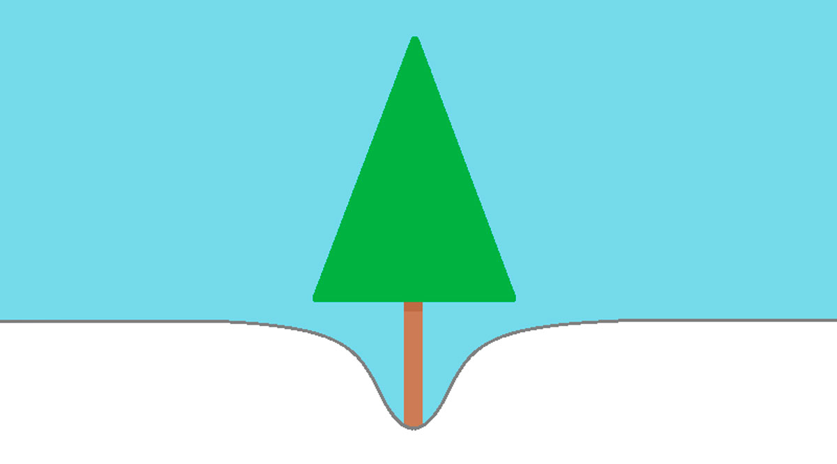 Под дерево не падает столько же снега, сколько вокруг него, так как крона, особенно у хвойных деревьев, задерживает часть снега. В результате под ветвями и вокруг ствола дерева образуется так называемая «еловая ловушка» — своеобразный колодец, где снег рыхлый и не может выдержать вес человека. Такая ловушка может достигать нескольких метров в глубину.