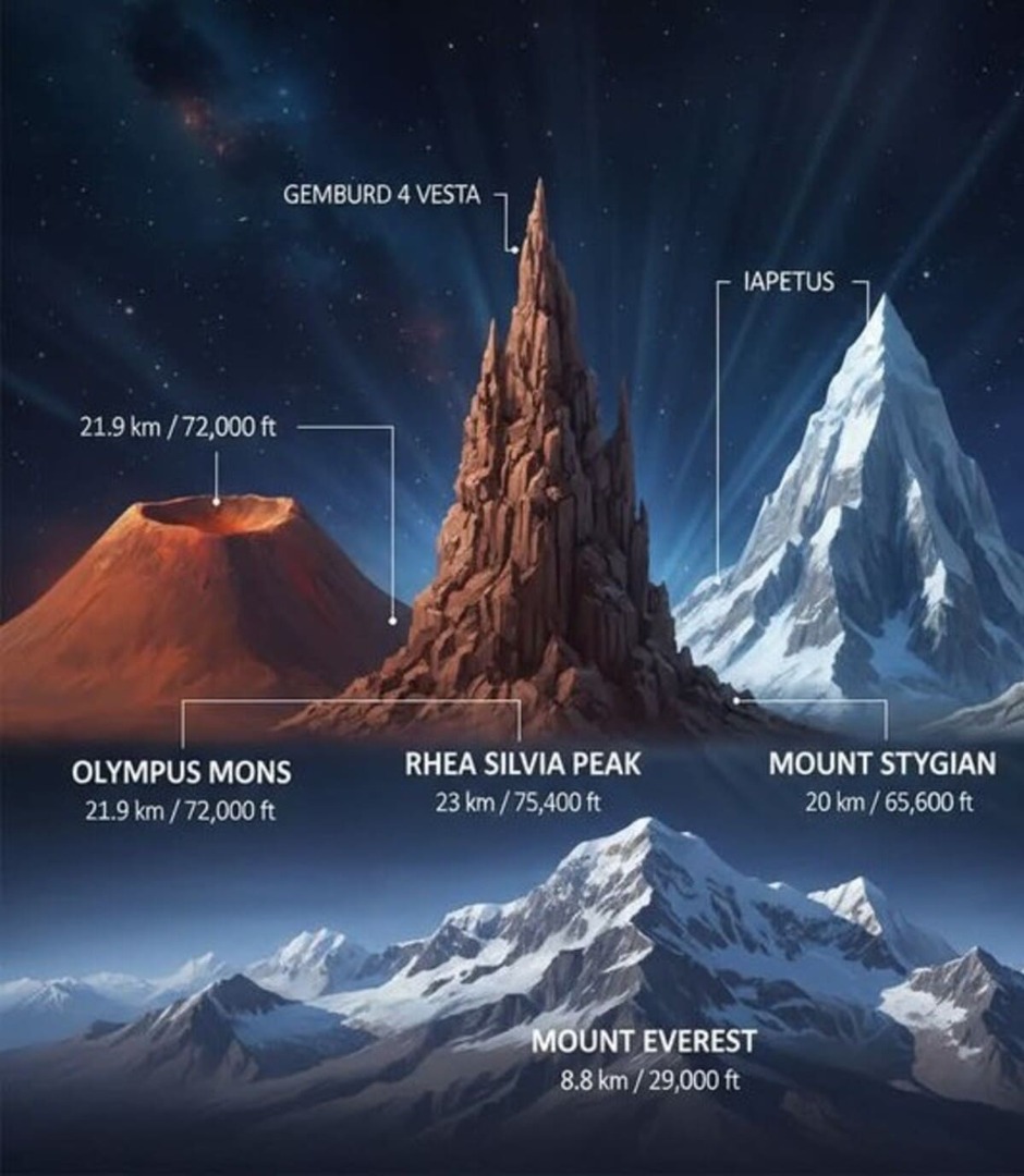 Инфографика: самые высокие вершины Солнечной системы в сравнении с Эверестом / © Black Hole