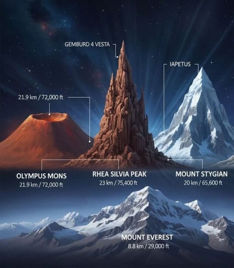 На втором месте — гора в центре кратера Реи Сильвии на астероиде Веста. Сам кратер имеет диаметр от 475 до 500 километров и считается одним из самых глубоких в Солнечной системе: его глубина достигает 20–25 километров. В центральной части возвышается гора высотой примерно 22–23 километра и диаметром около 180 километров, что делает ее второй по относительной высоте вершиной Солнечной системы после марсианского Олимпа.
