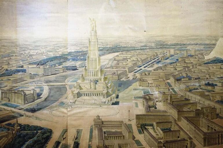 В начале 1930-х Борис Иофан выиграл конкурс на строительство Дворца Советов — гигантского здания высотой 495 метров со статуей Ленина наверху. Ради проекта в 1931 году снесли Храм Христа Спасителя. Строительство началось в 1937 году, но было остановлено войной и позже окончательно заброшено. В 1990-х годах храм восстановили.