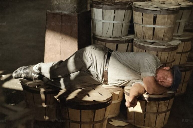 Мужчина спит на рыбном рынке. Балтимор, штат Мэриленд. США, 1938 год.
