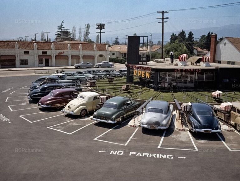 Заказы автомобилистов доставляли по электрическому конвейеру. Ресторан быстрого обслуживания был устроен как колесо: кухня в центре, а вокруг — парковка для машин. Конвейерная лента сама подвозила еду прямо к окну каждого посетителя. Инженерная мысль середины XX века — на службе у фастфуда.