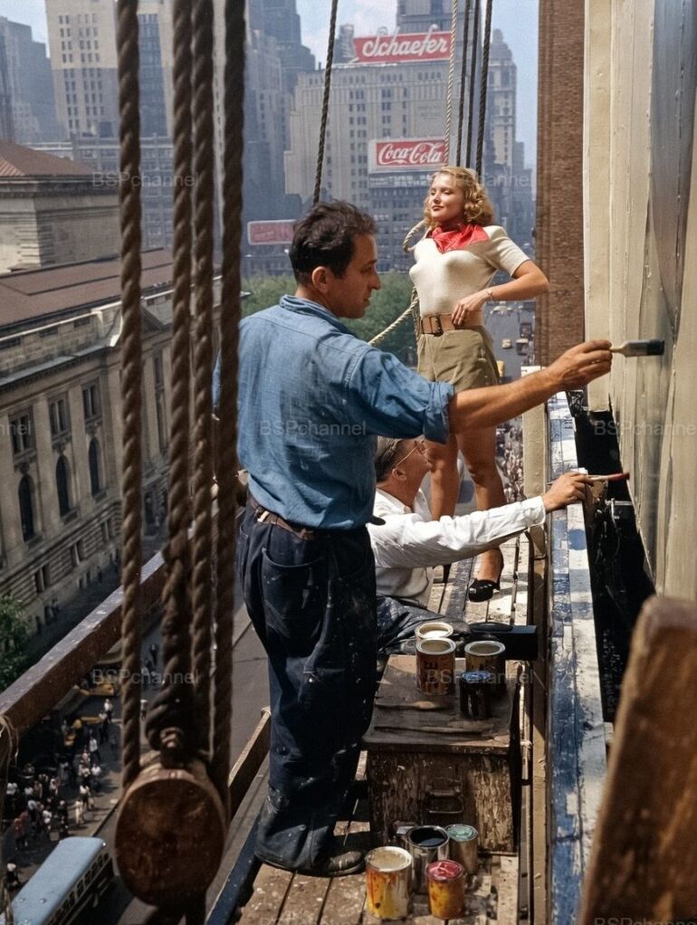Широкоформатных плоттеров ещё не придумали. Поэтому билборды рисовали вручную — на лесах и в подвесных люльках. На этом снимке работа над рекламой бюстгальтеров Peter Pan. Художники с кистями и красками, натурщица в центре, и никакого фотошопа. Так создавалась наружная реклама в 1940-х. Тяжёлый, опасный, но по-своему прекрасный труд.