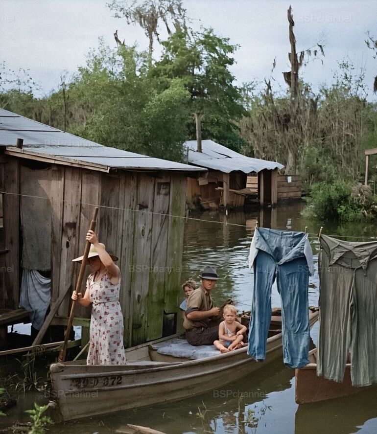 Семья рыбака возвращается с ранней утренней рыбалки недалеко от города Эйкерс, штат Луизиана, 1938 год.