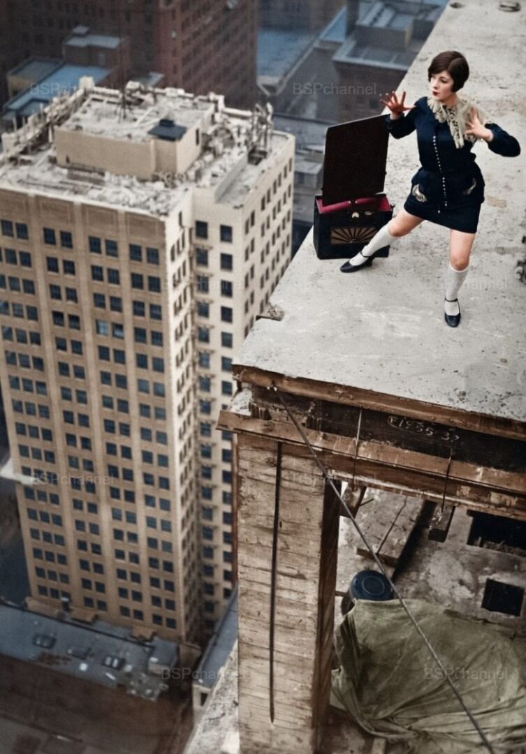 Танцовщица исполняет чарльстон на крыше строящегося небоскреба. Это был рекламный трюк для американских танцоров. США, 1926 год.