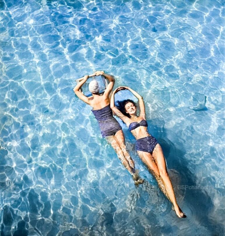 Модели в купальниках плавают в бассейне. США, 1948 год.