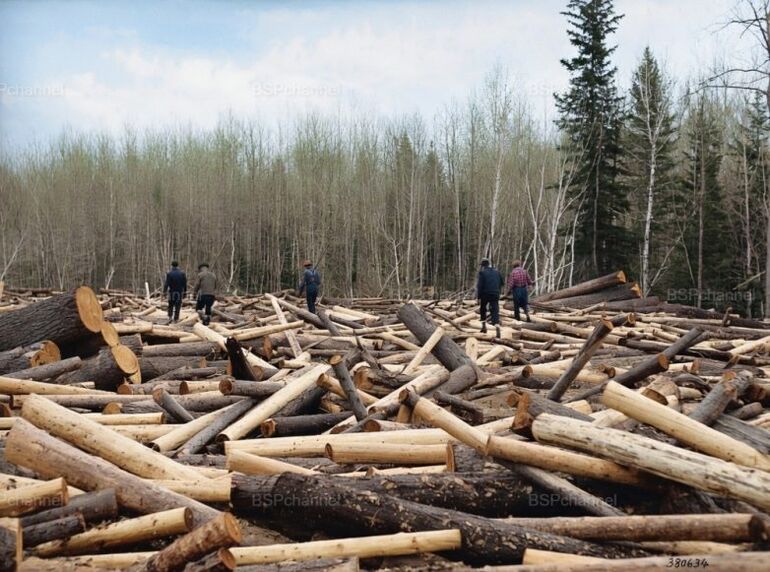 Лесорубы ходят по заготовленным брёвнам. США, Литтлфорк, Миннесота, 28 апреля 1937 года.