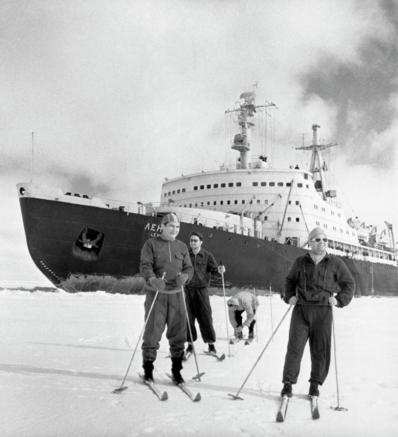 Члены экипажа атомохода «Ленин» вышли на лыжную прогулку во время короткой стоянки в арктических льдах