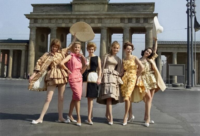 В 1960-е женская мода быстро перешла от скромных послевоенных силуэтов к дерзким новациям: мини-юбки (влияние Мэри Куант), геометрические узоры, яркие цвета, облегающие платья-футляры и брючные костюмы.
