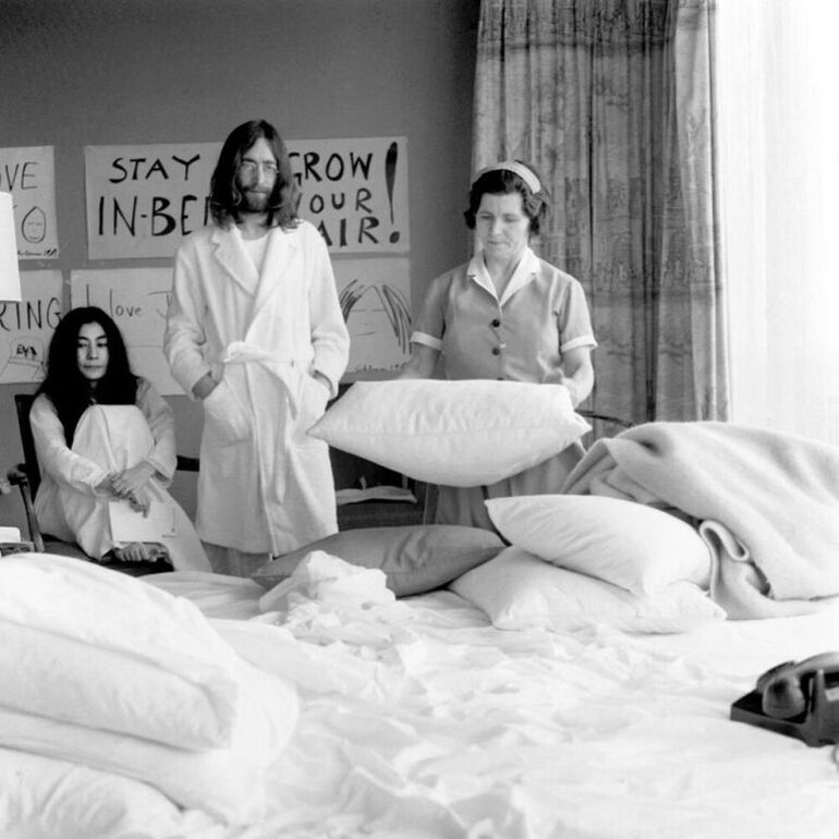 Джон Леннон и Йоко Оно ждут, пока горничная заправит кровать, чтобы они могли начать двухнедельную «постельную акцию» за мир
