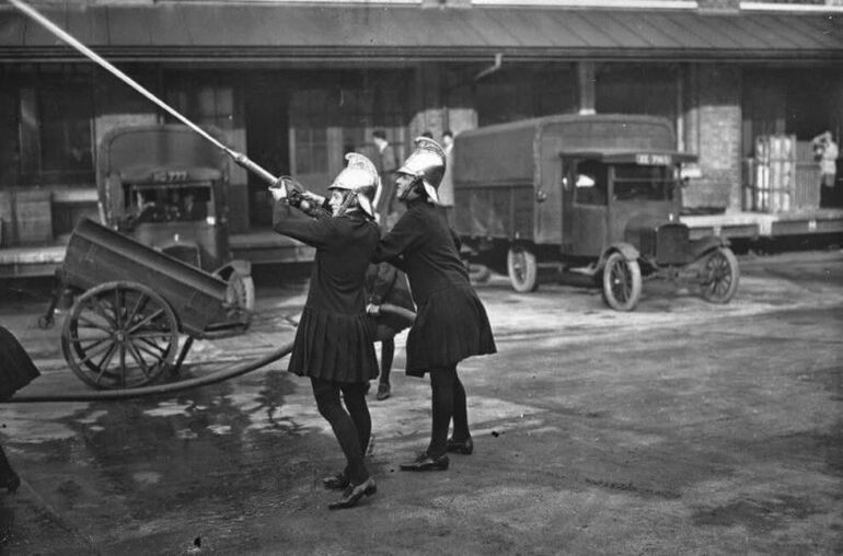 Женщины из женской пожарной команды «Ахиллес Серре» в Лондоне позируют с инвентарём