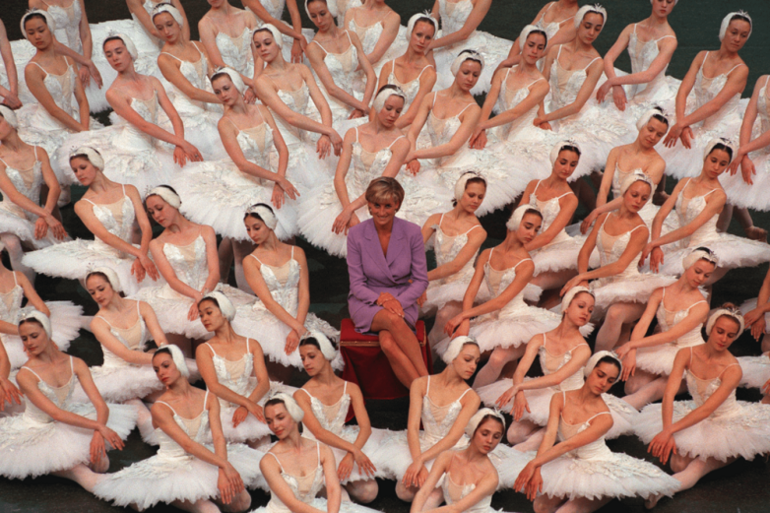 Принцесса Диана позирует с полным составом труппы Английского национального балета в постановке «Лебединое озеро», 3 июня 1997 года