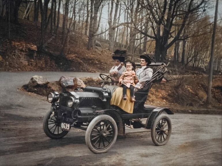 Миссис Мерль Вашель за рулем автомобиля со своим маленьким сводным братом, его няней и своей собакой. Монреаль, Канада, 1906 год.