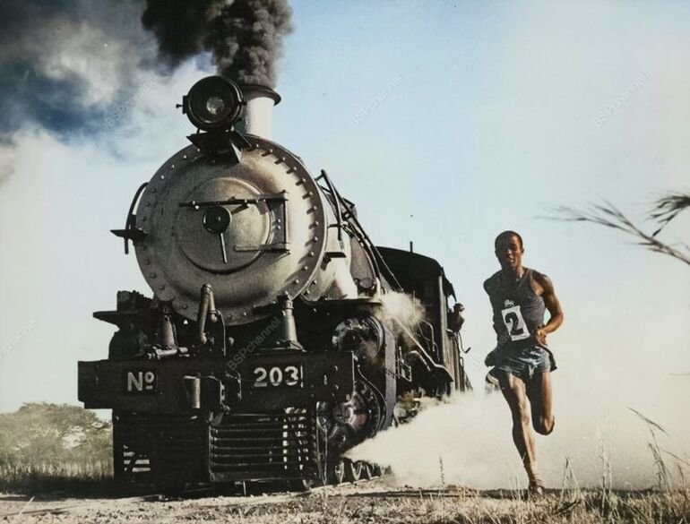 Африканский бегун Матиас Канда из Южной Родезии(ныне Зимбабве) бежит наперегонки с паровозом, 1968 год.