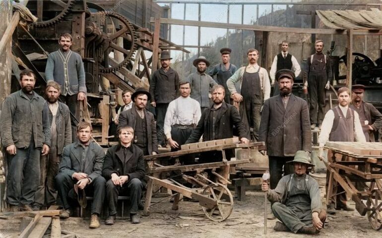 Рабочие-духоборы на кирпичном заводе CCUB в Гранд-Форксе, Британская Колумбия, около 1915 года.