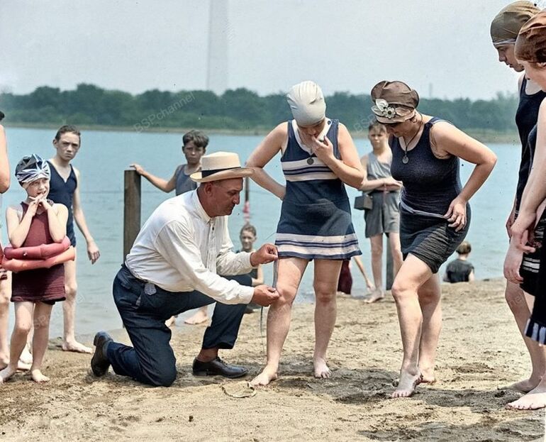 Работник пляжа официально измеряет купальные костюмы, чтобы убедиться, что они не слишком коротки. США, 1920-е.