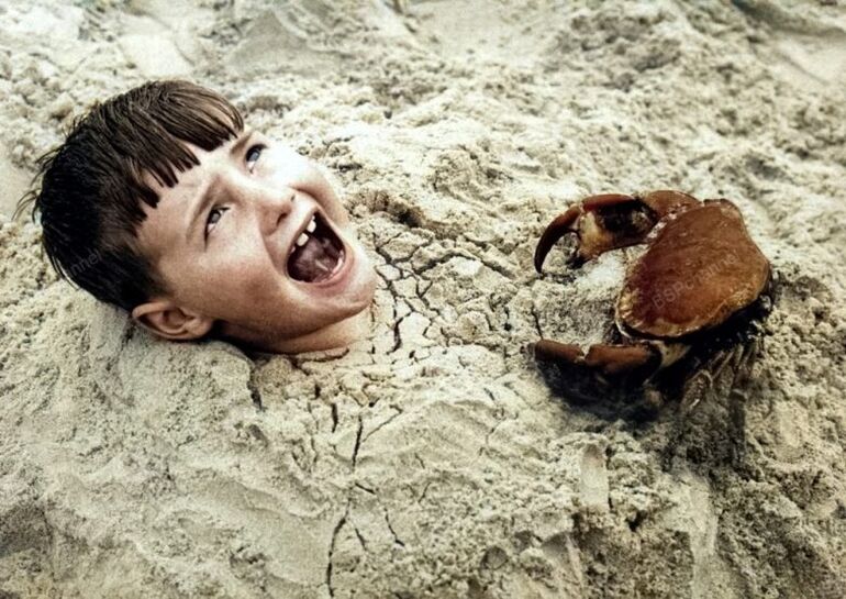 Краб атакует закопанного в песок мальчика, 1959 год.