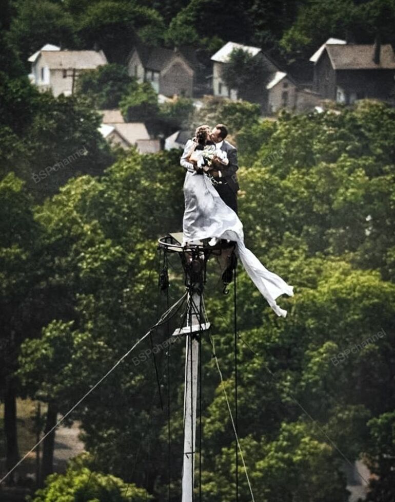Перед свадьбой пара целуется на флагштоке. Кошоктон, Огайо, июнь 1946 года.