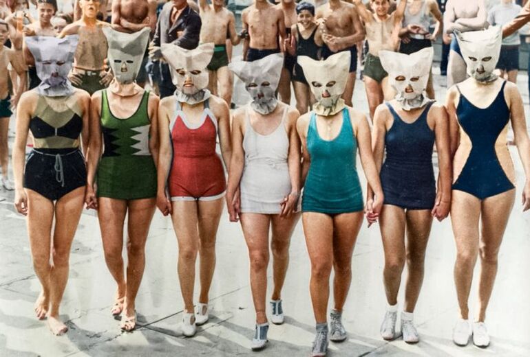 Семь женщин в купальниках. На Кони-Айленд состоялся конкурс красоты, в котором учитывалось только одно тело. Лица конкурсанток были скрыты масками. США, Кони-Айленд, 1935 год.