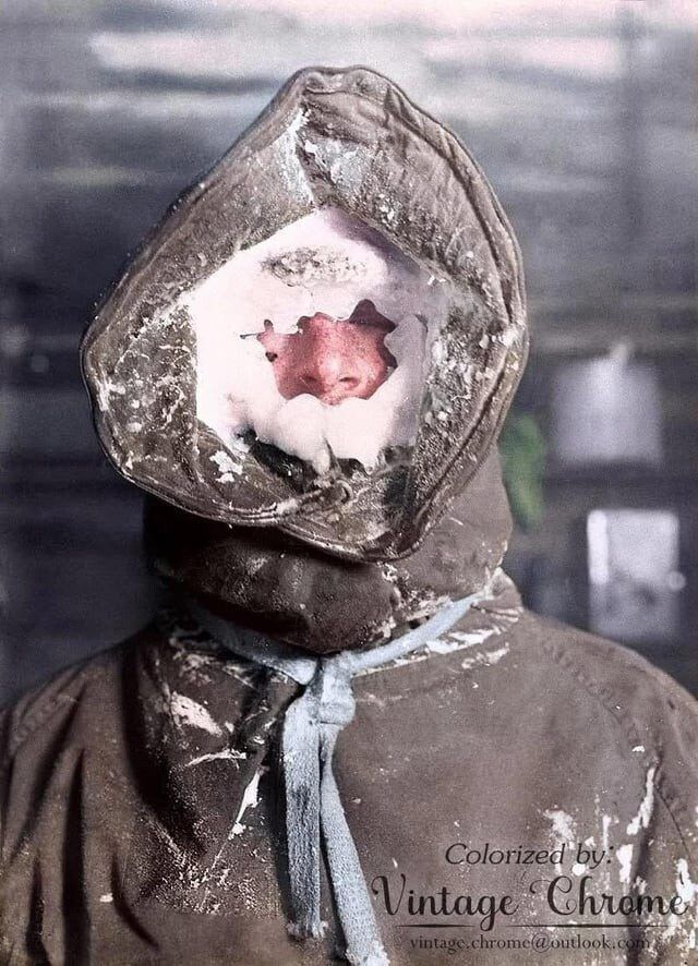 Во время метели, когда он возвращался на основную базу на мысе Денисон, вокруг его лица образовалась ледяная маска.