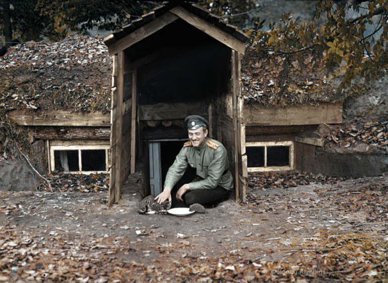 Русский офицер угощает кошку и ежа молоком во время перерыва между боями, 1916 год