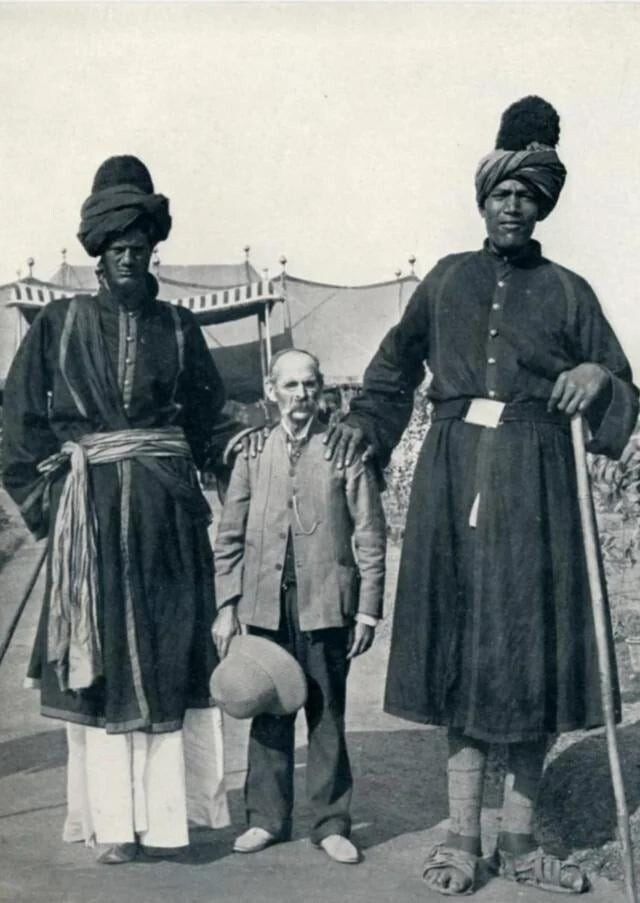 Два кашмирских охранника с фотографом Джеймсом Рикалтоном на делийском дарбаре в Британской Индии (1903 г.)