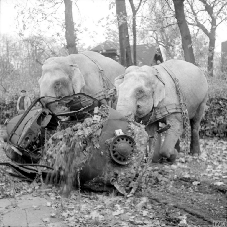 Два цирковых слона, Кири и Мэни, перемещают разбитую машину во время послевоенных работ по очистке Гамбурга, 5 ноября 1945 года