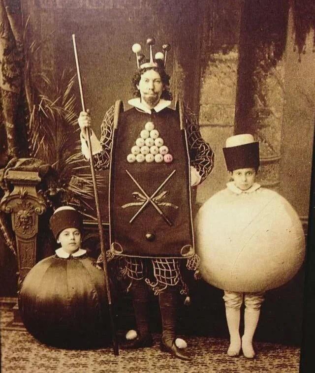 Мужчина в образе короля бильярда, с двумя сыновьями, одетыми бильярдными шарами, 1886 год