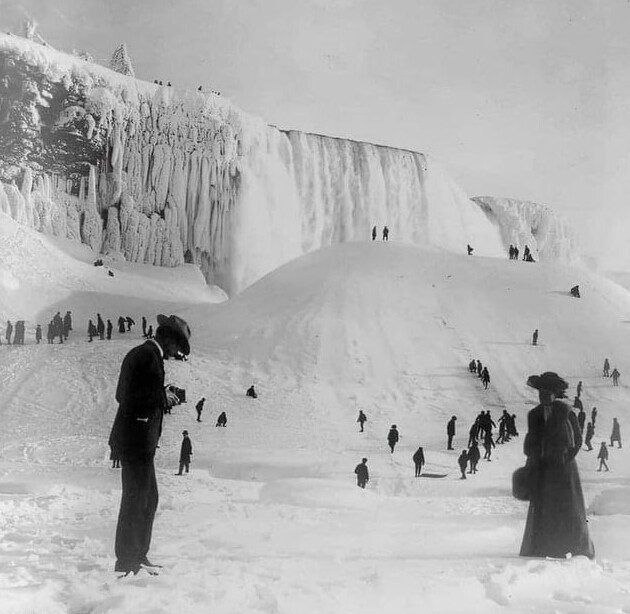 Люди наслаждаются редким видом замёрзшего Ниагарского водопада, 1911 год