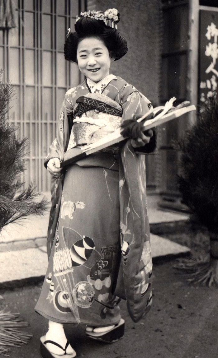 Улыбающаяся девушка в кимоно в новогодний день, Япония, 1914 год