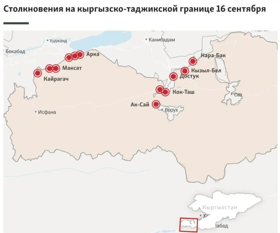 По последним данным, пострадали 42 киргизских пограничника. МИД Киргизии выразил ноту протеста Таджикистану из-за боевых столкновений на границе.