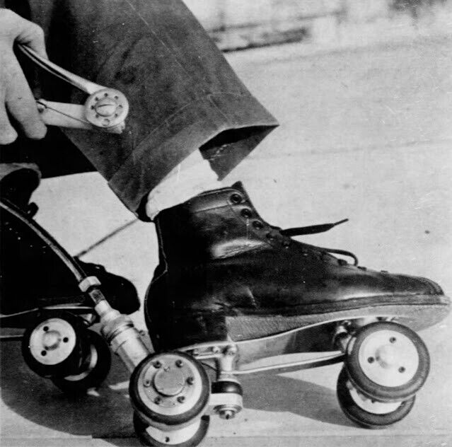 Второй трос соединяется с ручным сцеплением для регулировки скорости. Скорость была достаточно велика: эти роликовые коньки могли двигаться со скоростью до 40 миль в час (64 км/час)!