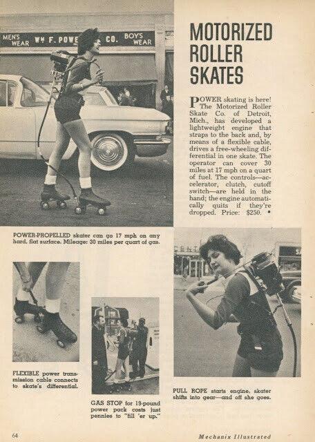 Самоходные коньки выпускались компанией Motorized Roller Skate Company из Детройта, начиная с 1956 года. Компания была основана в 1955 году неугомонным изобретателем из Линкольн-Парка, штат Мичиган, по имени Антонио Пиррелло (Antonio Pirrello).