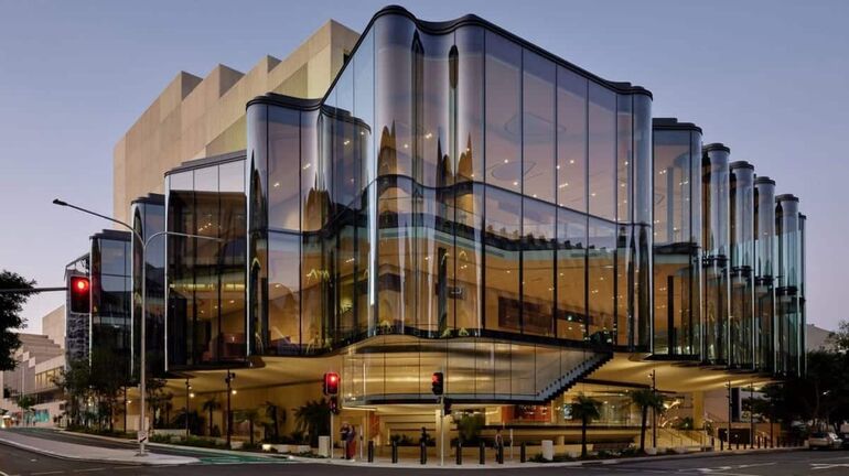 Волнистый стеклянный фасад театра в Брисбене охватывает консольный первый этаж, протягиваясь вдоль двух уличных фасадов. Его дизайн задуман так, чтобы визуально облегчить объем здания и превратить фойе на первом уровне в своего рода «открытый театр», доступный взглядам прохожих.