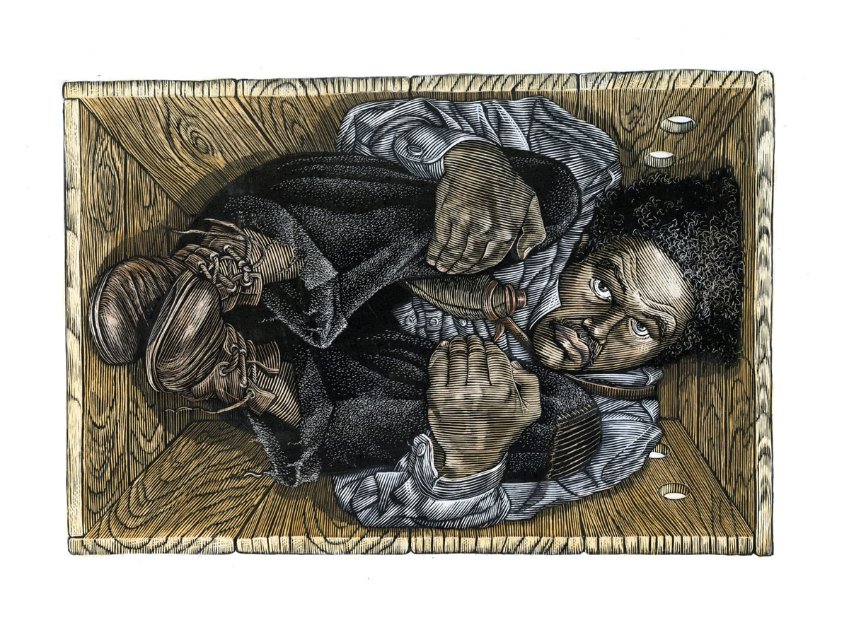 В день побега, чтобы уйти с работы, Браун до кости обжёг руку серной кислотой. Его поместили в коробку размером 91×81×61 см, обшитую сукном и затянутую ремнями, под тканью которой пряталось одно-единственное отверстие для воздуха. Браун позже писал: «Если вы никогда не были лишены свободы, как я, вы не сможете осознать всю силу надежды на освобождение из рабства, которая вела меня на этом пути».