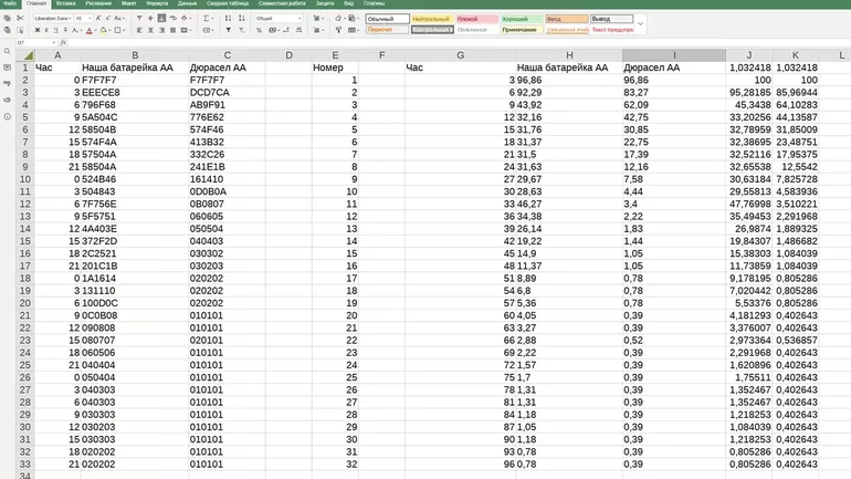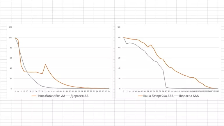 Батарейки «Наша батарейка» обошлись мне в 33,05 ₽/АА и 32,95 ₽/ААА, Duracell — 62,67 ₽/АА и 87,42 ₽/ААА. С учётом эффективности, мы получаем, «Наша батарейка» работает в 3,6 раза эффективнее в пересчёте на рубли.