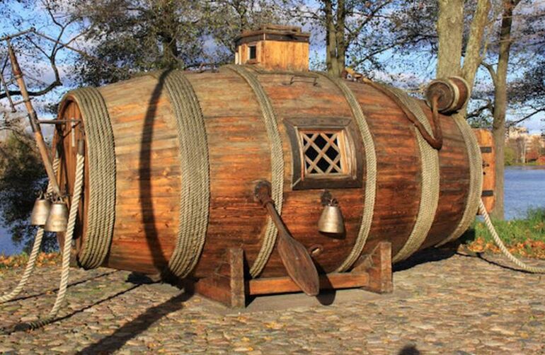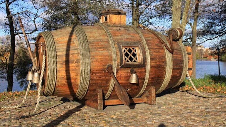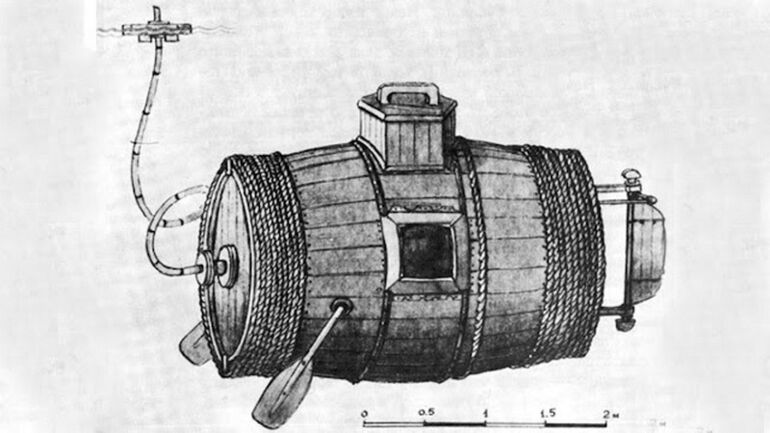 Внешне лодка была больше похожа на длинную шестиметровую бочку из дерева. Для надежности ее скрепляли железные обручи, а для герметичности обшили кожей. Пять членов экипажа приводили подводную лодку в движение с помощью весел. Погружался же корабль благодаря крошечным отверстиям, закрытым оловянными пластинами: через них вода наполняла кожаные мешки и медленно опускалась на дно. Чтобы подняться на поверхность, воду откачивали поршневым насосом.