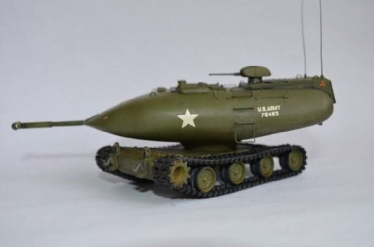 Его самой поразительной особенностью была капсулообразная башня, в которой размещались не только экипаж и основная 90-мм пушка, но также двигатель, трансмиссия и топливо. Все эти компоненты находились в водонепроницаемом корпусе, который мог плавать и приводиться в движение электроприводом.