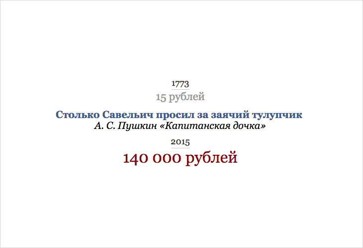 Сейчас Гринев потратил бы на все утраченное около 1 млн руб. (покупать-то надо в 10 раз больше), а заячий тулупчик, исходя их этого, был бы эквивалентом 140 тыс. руб.»