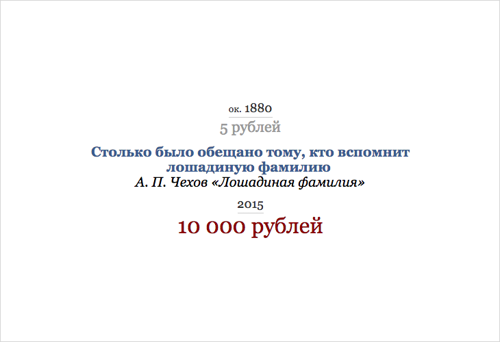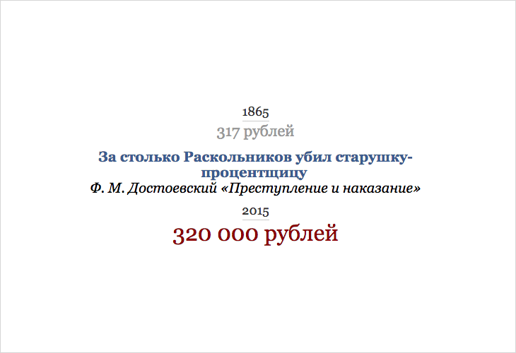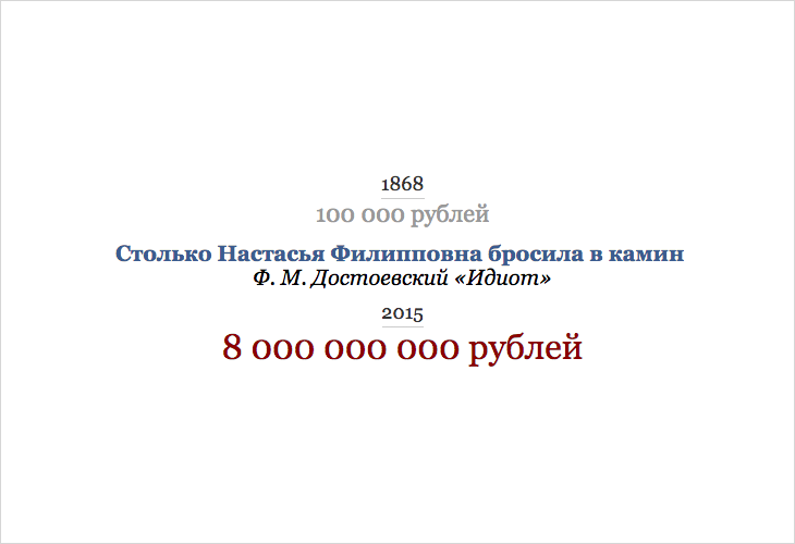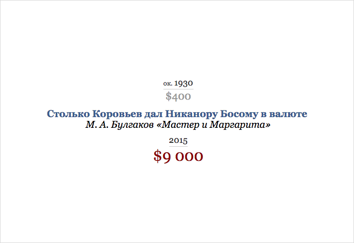 Журнал « » попробовал перевести упоминаемые в известных произведениях русской литературы денежные суммы в современную валюту. В обзор попали произведения Пушкина, Гоголя, Достоевского, Чехова и других классиков.