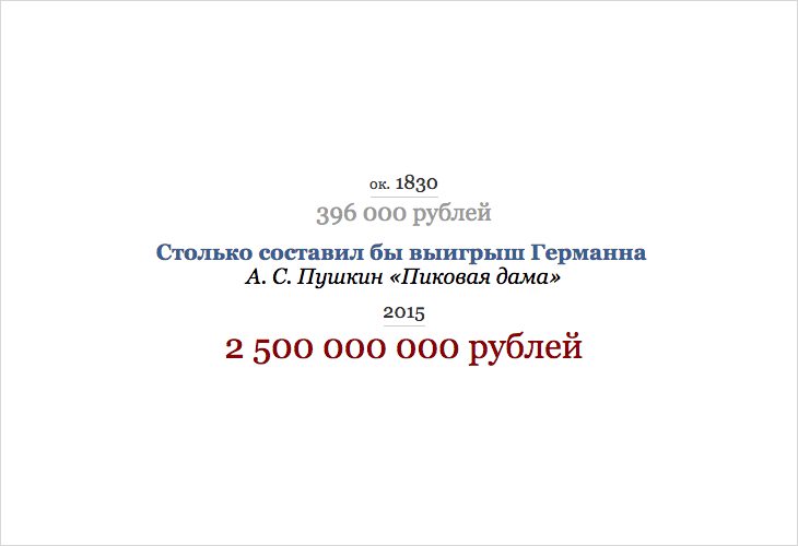 4. Сегодня нам несложно понять Германна: он желает из просто богатого человека, унаследовавшего какие-то жалкие 4–5 миллионов долларов в банке, иметь $40 млн, выиграв их у мультимиллионера Чекалинского. Или, если уж мы считаем на рубли, 2,5 млрд рублей.