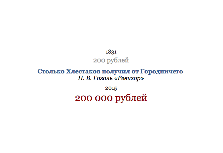 5. 200 рублей ассигнациями (вчетверо меньше, чем серебром) — неужели это большая взятка? Продовольственный минимум в России тогда обеспечивался доходом в 1,5–2 рубля серебром в месяц: если считать этот минимум для регионов РФ сейчас равным 7–8 тыс. руб. (это обычно так), то Хлестаков, поиздержавшийся в дороге, немедленно получил взаймы на мелкие расходы теперешние 200 тыс. руб.