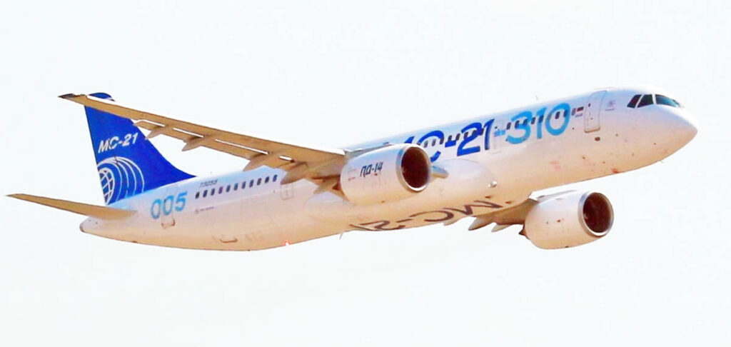 Один из построенных самолетов МС-21-310 с российскими двигателями ПД-14 во время летных испытаний